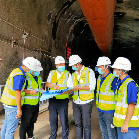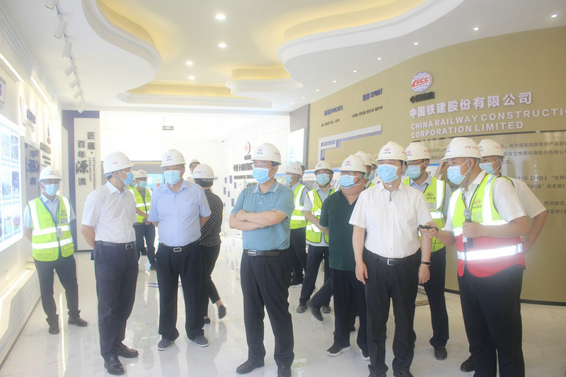 項(xiàng)目經(jīng)理曹元均(右1)向中國(guó)鐵建副總裁王立新(右2)一行匯報(bào)“一主三點(diǎn)九線”全方位技術(shù)管控做法受贊揚(yáng)