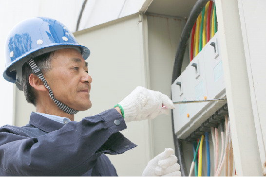 電工陳定明對(duì)施工現(xiàn)場(chǎng)配電設(shè)備進(jìn)行安全檢查