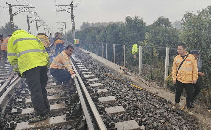 在王寨站北段道岔,淅瀝瀝的小雨下個(gè)不停。兩臺(tái)搗固車機(jī)器轟鳴地作業(yè)著,十幾名職工緊跟搗固車后面檢查質(zhì)量、回填道床。三堂集維修工區(qū)工長(zhǎng)胡守峰俯身跪在鋼軌上指揮起道,大機(jī)搗固不到的地方需要人工起道進(jìn)行補(bǔ)搗。六名職工雙手緊握內(nèi)燃搗鎬,在胡守峰起好道后,內(nèi)燃機(jī)械“嗡嗡”地噴著白煙,震動(dòng)著石砟擠進(jìn)枕底。雖說(shuō)是冒雨施工,然而現(xiàn)場(chǎng)卻呈現(xiàn)出一派熱火朝天的景象。