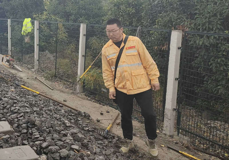 小雨下個(gè)不停?,F(xiàn)場(chǎng)中,二十多名職工冒雨緊張地作業(yè)著。二個(gè)多小時(shí)的封鎖天窗,要完成三組道岔的配合作業(yè),時(shí)間緊,任務(wù)重,必須爭(zhēng)分奪秒同時(shí)間賽跑。胡守峰指揮起道后,就緊跟從職工手中接過(guò)內(nèi)燃搗鎬。三堂集維修副工長(zhǎng)張向陽(yáng)放下道尺,拿起拉耙整理道床。操作手不使用起道機(jī)就幫忙回填道床,作業(yè)人員個(gè)個(gè)爭(zhēng)先恐后,為全面完成施工任務(wù),確保安全正點(diǎn),心向一處想,勁向一處使。