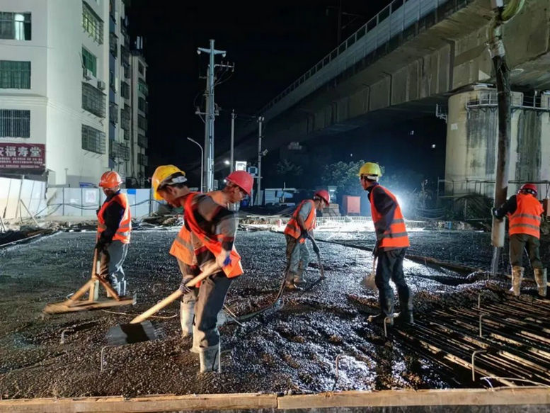 宜春大道370跨鐵橋橋梁共計(jì)6跨,2跨為預(yù)制梁,4跨為現(xiàn)澆板梁,橋梁上跨滬昆普鐵,下穿滬昆高鐵,施工受鐵路運(yùn)營(yíng)影響大,尤其4-6號(hào)墩臺(tái)位于高鐵橋下,起吊高度受限僅能利用晚23:00至凌晨4:00高鐵天窗開展吊車作業(yè)。為安全高效地利用好有限的作業(yè)時(shí)間,宜春涉鐵項(xiàng)目部結(jié)合“保安全、保質(zhì)量、保穩(wěn)定、促發(fā)展”黨員主題實(shí)踐活動(dòng),積極推行黨員干部帶班制,項(xiàng)目領(lǐng)導(dǎo)親自帶頭蹲點(diǎn),黨員干部劃區(qū)包片、包保班組,帶領(lǐng)項(xiàng)目團(tuán)隊(duì)倒排工期,科學(xué)組織,合理籌備,先后于10月15日完成右幅4-6號(hào)墩臺(tái)蓋梁澆筑,10月25日完成右幅現(xiàn)澆板梁鋼筋吊裝綁扎及模板安裝,并于當(dāng)日下午5點(diǎn)開始混凝土澆筑。