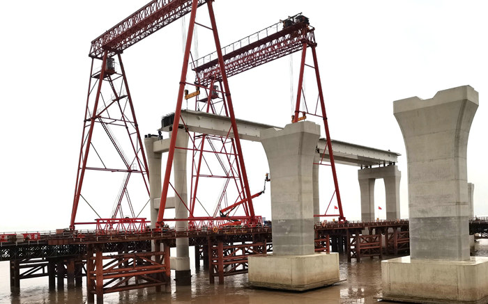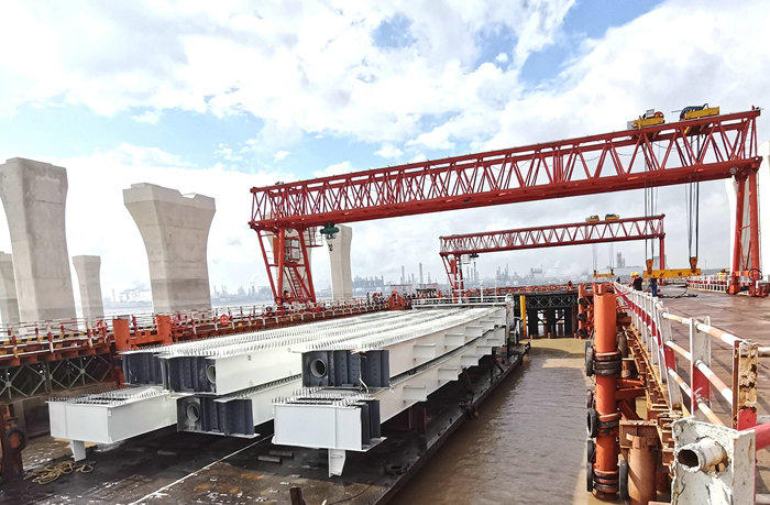 杭甬項目濱?;ネㄆ磳挊蚝?座匝道橋設(shè)計鋼箱梁493片,其中疊合梁297片,全部在舟山長虹鋼結(jié)構(gòu)有限公司生產(chǎn)。疊合梁是由裸梁經(jīng)過再加工而成的。疊合梁厚度一樣,寬度不等,長度在20米到60米之間,最重達(dá)170噸。由于前期在濱海互通建成卸梁站和提梁站,復(fù)雜的審批手續(xù)履行完畢,告別通過石化區(qū)碼頭卸裝和長途車輛運(yùn)輸費(fèi)時費(fèi)力、成本高的歷史,于10月25日正式投入使用,裝著6片鋼箱梁的貨船駛進(jìn)卸梁站。通航的順利進(jìn)行,為后面運(yùn)梁、卸梁、安裝梁躺平了道路。由于運(yùn)輸重型梁的條件具備,該項目從舟山將疊合梁裝上千噸級貨船,在海上航行數(shù)小時抵達(dá)濱海互通,在有關(guān)人員操控下,利用卸梁站、提梁站、卸貨平臺和4臺龍門吊、2臺履帶吊,采取提卸、裝運(yùn)、架設(shè)一條龍施工模式,加快了施工進(jìn)度。之前,為了確保各工序運(yùn)作過程的科學(xué)合理,項目部編制了便于操作的可行性施工方案,經(jīng)海事、業(yè)主有關(guān)專家對方案的評審認(rèn)定,付諸實施。在安全管控上,項目部高度重視,每天指定現(xiàn)場安全人員緊盯施工過程,發(fā)現(xiàn)不規(guī)范操作行為,立即叫停,在100%安全的情況下才準(zhǔn)許施工。同時加強(qiáng)對卸梁站、提梁站、運(yùn)輸車輛、履帶吊等特種設(shè)備的安全檢測,不放過一個疑點,不給事故留下安全隱患。
