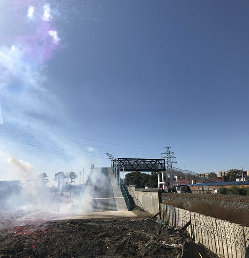隨著震耳欲聾的鞭炮聲,中鐵二十三局二公司齊北線齊富增建二線工程項(xiàng)目經(jīng)理部承建的齊北線K1+289.7公里人行天橋正式開通了,隨著這一座人行天橋的開通,可進(jìn)一步緩解越過鐵路道口時(shí)的擁堵情況,改善道路通行條件。