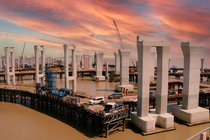 杭甬復(fù)線濱海互通設(shè)主線橋、拼寬橋和8座匝道橋,全長9705米,樁基1027根、承臺172座、橋墩634座,是亞洲最大的海上樞紐立交,3次上跨、4次下穿全長21公里的金塘大橋。該立交是杭州灣大灣區(qū)的重要交通基礎(chǔ)建設(shè)工程,建成后,將縮短省會城市杭州與寧波、舟山、余姚、慈溪出行、客運、貨運距離,對改善浙江省交通運輸壓力、接軌上海、加強與長江三角洲地區(qū)交流與合作,提升全省品質(zhì)和形象,推動沿線旅游和經(jīng)濟發(fā)展具有十分重要的意義。