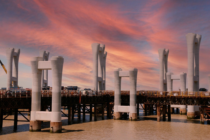 去年初,濱?;ネū涣袨樵擁椖坎康闹麝嚨?,采取多點攻堅、多工序同步舉措,加快鋼棧橋、樁基、承臺等分項工程建設(shè)速度,為匝道橋墩施工創(chuàng)造條件。同時,根據(jù)濱海互通規(guī)模大、管理團隊80%的是80、90后、海上施工經(jīng)驗不足等特點,項目部成立了由公司副總經(jīng)理兼杭甬項目負責(zé)人黃偉、總工和其他班子成員組成的科技攻關(guān)小組,每周對項目進行一次深度研判,預(yù)測可能出現(xiàn)的各種不利因素,制定科學(xué)的應(yīng)對方案。