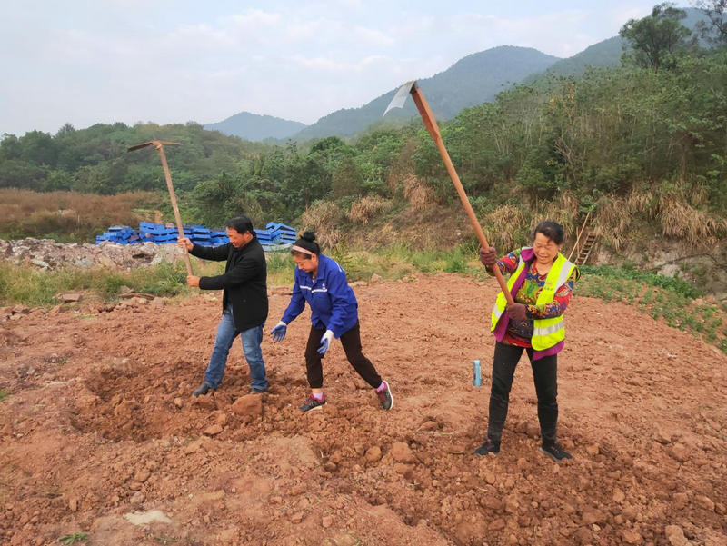 項(xiàng)目部勤雜工張鳳玲(中)、王坤蘭和小車司機(jī)龔世民在棄土場刨地
