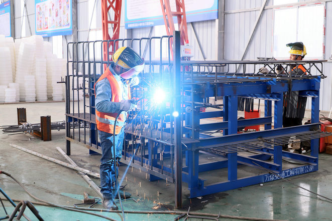 (北新路橋集團(tuán)安徽宿固高速土建二標(biāo)施工現(xiàn)場(chǎng)進(jìn)行預(yù)制箱涵側(cè)墻鋼筋骨架制作。孫夢(mèng)凱攝。)