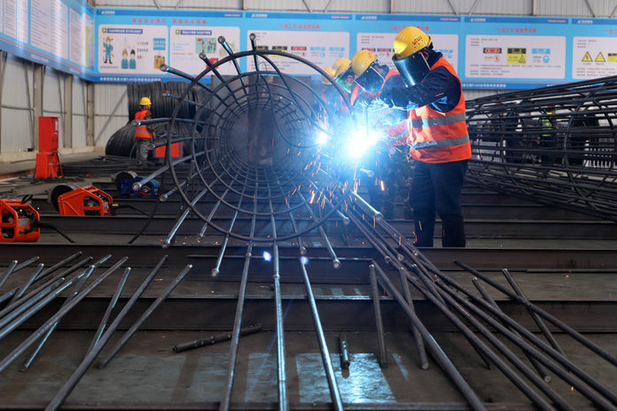 (北新路橋集團(tuán)安徽宿固高速土建二標(biāo)施工現(xiàn)場(chǎng)進(jìn)行樁基鋼筋籠焊接。孫夢(mèng)凱攝。)