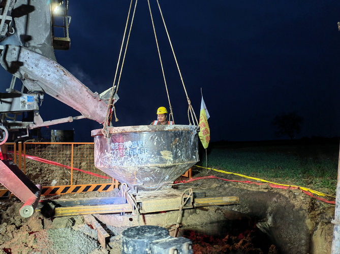 (北新路橋集團(tuán)安徽宿固高速土建五標(biāo)沱河大橋夜間灌注樁基水下混凝土。 桂欣華攝。)
