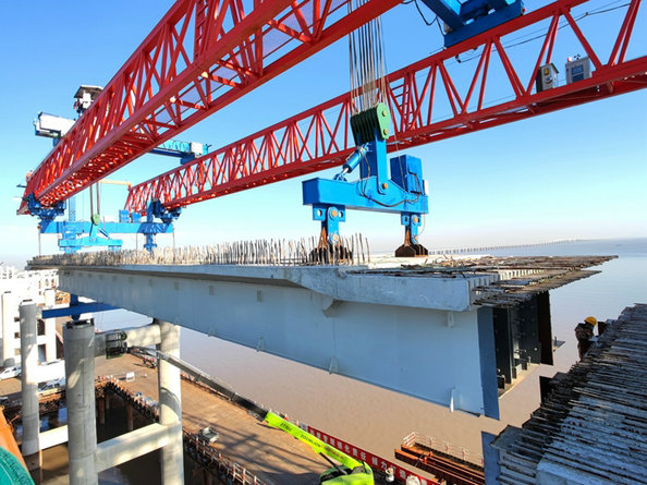 濱?;ネㄈL9705米,由4座拼寬橋、8座匝道橋組成,設(shè)計墩柱634座、鋼箱梁194片、疊合梁299片。鋼箱梁和疊合梁長20米—50米,20噸——190噸。為實現(xiàn)集團公司主管領(lǐng)導(dǎo)提出的2021年底架設(shè)第一片梁的目標(biāo),該項目部經(jīng)過充分調(diào)研和論證,在選好鋼箱梁生產(chǎn)廠家之后不久,又選擇一個生產(chǎn)疊合梁的施工隊,鋼箱梁與疊合梁生產(chǎn)同步進行,11月底生產(chǎn)出第一片梁。從舟山到寧波海上運梁復(fù)雜手續(xù)辦妥后,實施海上運梁計劃,鋼箱梁運至鎮(zhèn)海石化管委會碼頭,再倒運至工地,12月29日架設(shè)第一片鋼箱梁。為節(jié)省成本、提高工效,該項目部實施第二個計劃,即建成1座卸梁站和2座提梁站,利用存梁平臺、龍門吊、履帶吊等設(shè)施和設(shè)備架設(shè)鋼箱梁和疊合梁。由于拼寬段橋梁上部結(jié)構(gòu)不規(guī)則,架設(shè)難度大,疊合梁長且重量在150噸—190噸之間,現(xiàn)有設(shè)備架梁安全風(fēng)險高,難以滿足進度需要。該項目部經(jīng)過慎重考慮,決定租賃兩臺自重各215噸、長66米、寬12米、高11.4米的架橋機用于架設(shè)疊合梁。這兩臺由支腿、主梁、兩臺提梁天車等組合而成的軌道式預(yù)制梁吊裝架橋機,性能好、操作方便安全,能滿足大坡度、小半徑彎橋、斜橋架梁要求,一次可承載200噸的橋梁。具體操作方法是,由提梁站龍門吊將疊合梁吊至20多米高處的自平衡運梁車上,再推送到架橋機上,在指揮人員指導(dǎo)下,架橋機載著梁體緩緩向前移動到指定位置,然后安放就位。