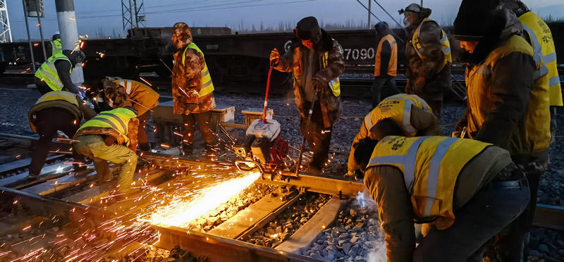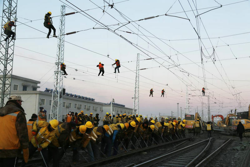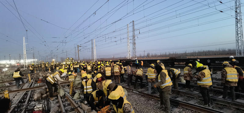12月27日,400余名工人冒著零下17度的嚴(yán)寒經(jīng)過連續(xù)8.5小時(shí)的鐵路二級封鎖施工,成功拆除既有道岔6組,線路59.43米,插入道岔5組,補(bǔ)充軌排46.16米,同步哈密東Ⅱ場(駝峰尾部)、Ⅲ場(上行出發(fā)場)新增信號設(shè)備安裝調(diào)試,室內(nèi)外配線拆改,新聯(lián)鎖、CTC軟件更換及聯(lián)鎖試驗(yàn),軋道試驗(yàn)、改方、場聯(lián)試驗(yàn);調(diào)度所局中心服務(wù)器數(shù)據(jù)修改,完成哈密東Ⅲ場接觸網(wǎng)接觸懸掛撥移、過渡、調(diào)整,哈密東Ⅱ、Ⅲ場聯(lián)絡(luò)線Ⅱ-2#與Ⅱ-3#支柱間接觸網(wǎng)線索對接、分段絕緣器安裝及調(diào)試,隔開引線安裝及調(diào)整,接觸網(wǎng)熱滑試驗(yàn)。標(biāo)志著由中鐵二十一局集團(tuán)承擔(dān)施工的哈密東站擴(kuò)能改造工程順利完成。