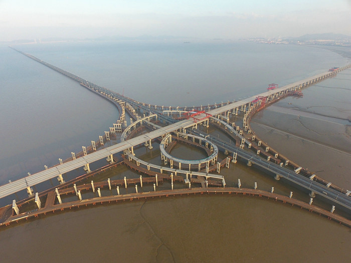 杭甬復(fù)線濱?;ネㄔO(shè)計呈苜蓿葉狀,設(shè)主線橋、拼寬橋、8座匝道橋,全長9705米,位于寧波市鎮(zhèn)海區(qū)淺海水域,設(shè)1027根樁基、169座承臺、636座墩身,采用花瓶墩和圓柱式墩造型。該互通3次上跨、4次交匯金塘大橋,建成后,是東海海域?qū)幉ň硟?nèi)一道雄偉壯觀的人文景觀,將成為寧波市的標(biāo)志性建筑。