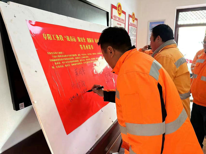 當(dāng)前正值戰(zhàn)春運(yùn)、保安全的關(guān)鍵時(shí)期,為確保春運(yùn)安全暢通提供優(yōu)質(zhì)可靠的設(shè)備保障,阜陽工務(wù)段聚焦“平安春運(yùn)、有序春運(yùn)、溫馨春運(yùn)、讓旅客體驗(yàn)更美好”總體要求,在全段黨員中舉行“戰(zhàn)春運(yùn)、保安全、迎新春、奮力實(shí)現(xiàn)開門紅”簽名承諾活動。亳州線路車間黨支部積極響應(yīng),認(rèn)真組織落實(shí)段有關(guān)要求,號召黨支部全體黨員立即行動起來,亮明身份,爭當(dāng)先鋒,在保春運(yùn)、保安全、保暢通中發(fā)揮出黨員的模范帶頭作用,扎根一線,奮勇拼搏,確保春運(yùn)期間京九線列車運(yùn)行安全暢通。