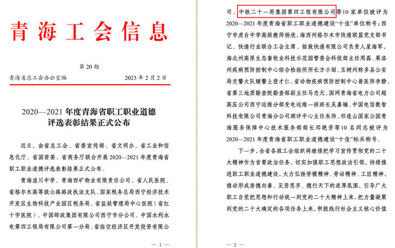 近日,由青海省總工會(huì)、省委宣傳部、省文明辦、省工業(yè)和信息化廳、省國(guó)資委、省商務(wù)廳聯(lián)合開(kāi)展的 2020—2021 年度青海省職工職業(yè)道德評(píng)選表彰結(jié)果正式公布,中鐵二十一局四公司被評(píng)為2020—2021 年度青海省職工職業(yè)道德建設(shè)“十佳”單位稱(chēng)號(hào)。