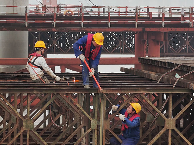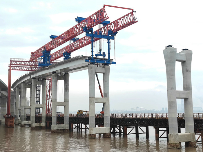 元宵節(jié)前后這段時間,杭州灣地區(qū)與往年相比,雨水激增,杭甬復(fù)線互通位于鎮(zhèn)海區(qū)海域,連綿不絕的雨水給運梁、架梁、拆除棧橋和橋面混凝土施工帶來一定困難。雨水天一個突出特點是,氣溫低、濕滑,有雨必有風,可謂風雨交加?;颐擅傻臍饬骰\罩著氣勢恢宏的濱?;ネ?,動蕩不安的海水越發(fā)不安分。置身于棧橋上、高空橋梁上的員工們經(jīng)受著雨水的“沐浴”,冷得渾身發(fā)抖,可是不到下班時間不能隨便離開。穿上雨衣干活,顯得笨手笨腳,而雨衣常常在施工過程中不小心被釘子、鋼筋劃破,哪個員工的雨衣都有幾個口子,雨水會順著不起眼的裂口流進里面的衣服上。這還不算啥,濕漉漉的天氣潛伏著安全隱患才值得警惕。由于腳下的地面都是水,容易滑倒摔傷。但不能因為下雨而停工,除非遇到大雨或暴雨、7級以上大風,才撤離現(xiàn)場。一般小雨和6級以下風力,都要照常施工。季節(jié)性的變化是自然規(guī)律,誰也阻止不了雨水的降臨。為了員工的安全,項目部按照雨天安全管理辦法,由現(xiàn)場負責人、安全總監(jiān)、專職安全員每天在工地巡檢,在排除安全隱患的同時,最有效的辦法便是大聲提醒作業(yè)員工,上班要穿防滑鞋,走路要小心,臨水和高空作業(yè)要系好保險繩,不能嫌麻煩、圖省事,要在保證個人的生命安全的前提下進行施工。濱?;ネㄊ墙衲晟习肽旯缘闹刂兄兀媱澤a(chǎn)鋼箱梁232片、疊合梁90片,現(xiàn)澆橋面板41聯(lián),安裝防撞欄14472米,完成鋼箱梁架設(shè)142片、疊合梁90片。任務(wù)都分解到各施工隊,規(guī)定了完成任務(wù)的節(jié)點,從項目部到施工隊員工,以不畏難、不怕苦、勇?lián)?、只爭朝夕的拼搏精神投入到工作中。兩個棧橋隊以每天拆除30多平米棧橋的速度向前推進。舟山梁場晝夜不停地生產(chǎn)加工鋼箱梁、疊合梁。橋面施工隊組織機械和人力緊鑼密鼓地鋪設(shè)鋼筋網(wǎng)、澆筑混凝土。卸梁站、提梁站以及運梁車和兩臺架橋機的操控人員,在現(xiàn)場管理人員指導(dǎo)下緊張有序地進行作業(yè)。