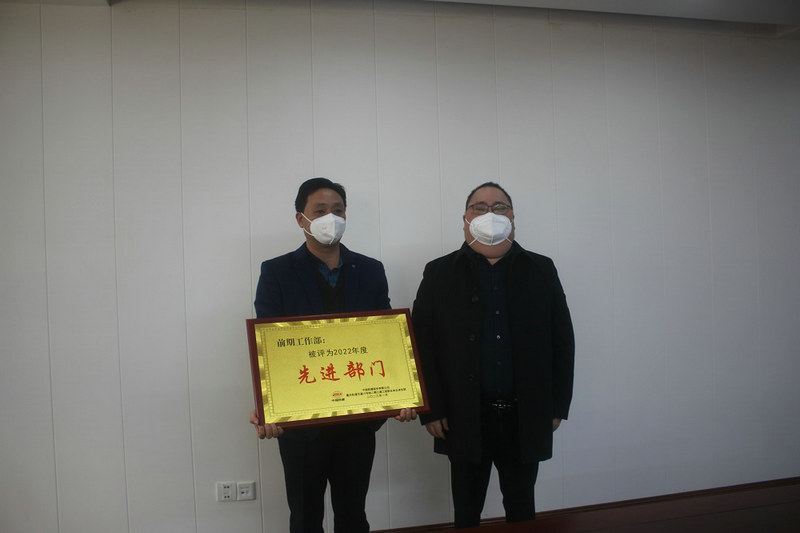 總承包部指揮長李兵(右)為前期工作部頒發(fā)獎牌
