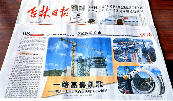 “初冬時(shí)節(jié),捷報(bào)頻傳。灣溝北站站場(chǎng)破土動(dòng)工,中鐵二十三局沈白高鐵建設(shè)項(xiàng)目全線啟動(dòng);碧水奔流,聲震峽谷。灣溝特大橋、跨201國(guó)道大橋、湯河1#2#3#大橋等橋墩巍然挺立,經(jīng)受住了滔滔洪水的嚴(yán)峻考驗(yàn);施工現(xiàn)場(chǎng),機(jī)聲隆隆。掌子面上工人們手持鑿巖機(jī)緊張作業(yè),不斷改寫(xiě)掘進(jìn)日進(jìn)尺的最新紀(jì)錄……一條條隧道、一座座橋梁、一段段路基,穿越大山、跨過(guò)江河、橫跨村屯,講述著沈白高鐵項(xiàng)目建設(shè)的動(dòng)人故事,展現(xiàn)著中鐵二十三局全體建設(shè)者的時(shí)代風(fēng)采。”這是長(zhǎng)篇通訊《一路高奏凱歌》的“開(kāi)場(chǎng)白”。
