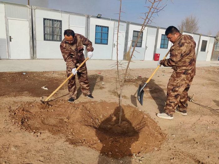 植樹現(xiàn)場,一派緊張、有序的繁忙景象,參加植樹的職工們個個熱情洋溢、干勁十足。大家有的扶苗、有的培土、有的挖坑,各個環(huán)節(jié)銜接有序,配合默契,充分發(fā)揚了團(tuán)結(jié)、互助、友愛的精神。一個早上的辛勤勞作,成功完成植樹30余棵。一排排樹苗盎然挺立,在和煦的春風(fēng)中煥發(fā)出勃勃生機(jī)。“參加這次活動,我覺得很有意義,既美化了我們的工作生活環(huán)境,也增強(qiáng)了團(tuán)隊的凝聚力,同時也用實際行動踐行了綠水青山就是金山銀山的環(huán)保理念。樹立了項目部良好的形象,為后續(xù)施工生產(chǎn)奠定了良好基礎(chǔ)。”該項目職工劉磊說道。
