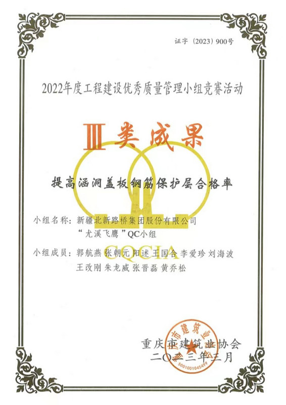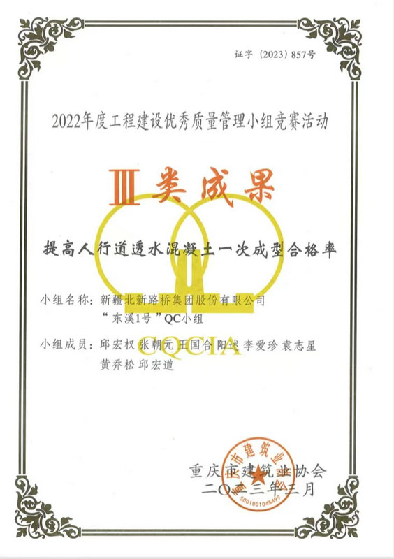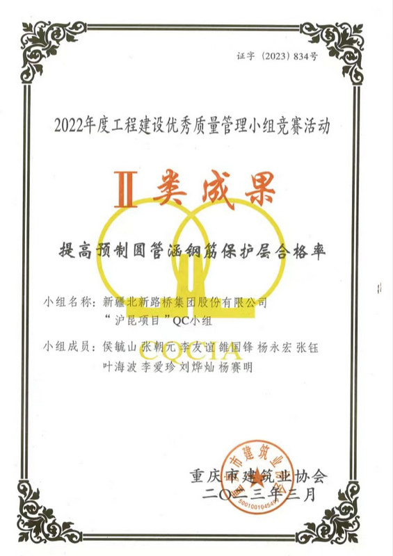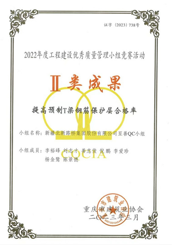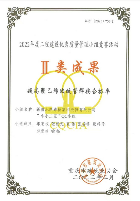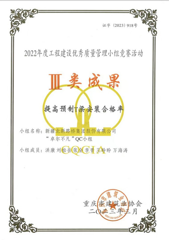 長沙訊(通訊員:盧仕磊)近日,從重慶市建筑業(yè)協(xié)會(huì)傳來捷報(bào),由北新路橋集團(tuán)長沙分公司牽頭組織、創(chuàng)立并負(fù)責(zé)申報(bào)的QC成果榮獲Ⅱ類成果、Ⅲ類成果各3項(xiàng)的優(yōu)異成績。