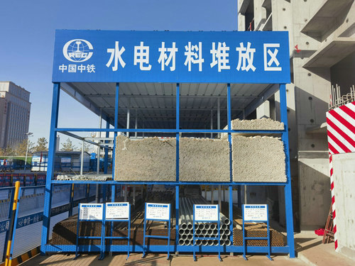 嚴(yán)格落實現(xiàn)場安全文明施工管理。項目部在進(jìn)入工地的入口處放置“八牌一圖”,在施工現(xiàn)場危險部位設(shè)置明顯的安全警示標(biāo)志以及安全標(biāo)語等,并在物料堆放及施工通道等區(qū)域均采用噴有企業(yè)logo的制式圍擋進(jìn)行分隔。根據(jù)施工現(xiàn)場平面布置圖分區(qū)域架空放置建筑材料、現(xiàn)場制品、半成品、成品等,對堆放的材料掛上標(biāo)牌,注明名稱、品種、規(guī)格等信息,設(shè)立現(xiàn)場巡視人員,確保材料、設(shè)備的安全。