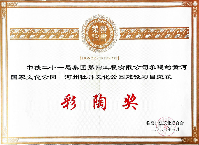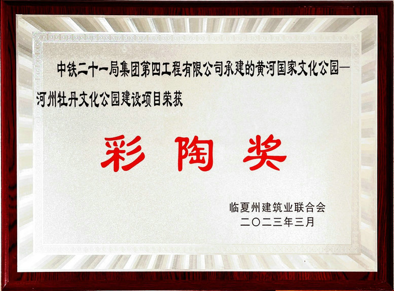 近日,由中鐵二十一局四公司承建的黃河國(guó)家文化公園—河州牡丹文化公園建設(shè)項(xiàng)目榮獲臨夏州建筑業(yè)聯(lián)合會(huì)頒發(fā)的2022年度臨夏州建筑業(yè)彩陶獎(jiǎng)。