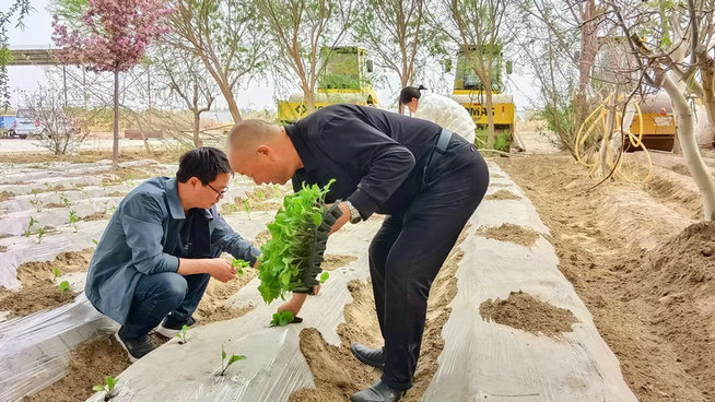 4月16日,組織職工在項目部生活區(qū)開辟的菜園里,一起動手種植菜苗、菜籽,在“職工菜園”正式移栽經(jīng)過育苗的作物,大家用鐵鍬、耙子除去地面雜物,三角溝開槽種菜,隨后依次種上大蔥、辣椒、茄子、西紅柿、蘿卜等蔬菜。