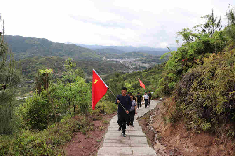 “五星紅旗迎風(fēng)飄揚(yáng),勝利歌聲多么響亮,歌唱我們親愛的祖國(guó),從今走向繁榮富強(qiáng).....”伴隨著大家的歌聲,隊(duì)伍來到了牛頂尖山腳下。