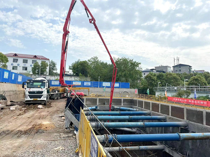 污水處理廠擴容工程占地面積0.35公頃,擴建規(guī)模1萬m/d,是廬山城鄉(xiāng)污水治理工程重難點工程。工藝流程為:預處理+BFM工藝+連續(xù)砂濾池,出水水質(zhì)一級A排放標準。包含結(jié)構(gòu)、建筑、設備、電氣、自控、暖通等專業(yè);新建的構(gòu)(建)筑物有:細格柵及旋流沉沙池、BFM-B池、BFM-M池、鼓風機房、生物除臭裝置、流量計井等。此次澆筑的是該構(gòu)筑物BFM-B池底板,基坑尺寸為26.7*13.7*9.45m,地下9.45m;約300立方混凝土。為順利完成澆筑任務,施工前期項目部制訂了切實可行的施工方案,并對作業(yè)人員進行詳細的技術(shù)、安全交底,精心組織,工序銜接緊密,嚴格按照施工規(guī)范和操作規(guī)程進行,為7月底完成節(jié)點目標奠定了基礎(chǔ)。