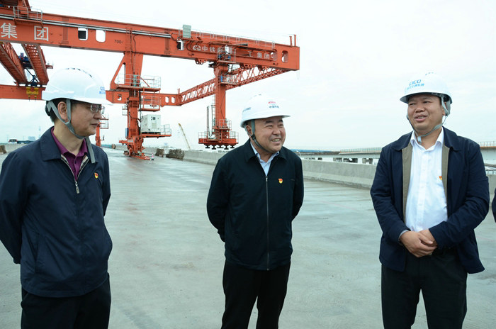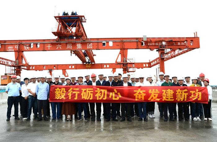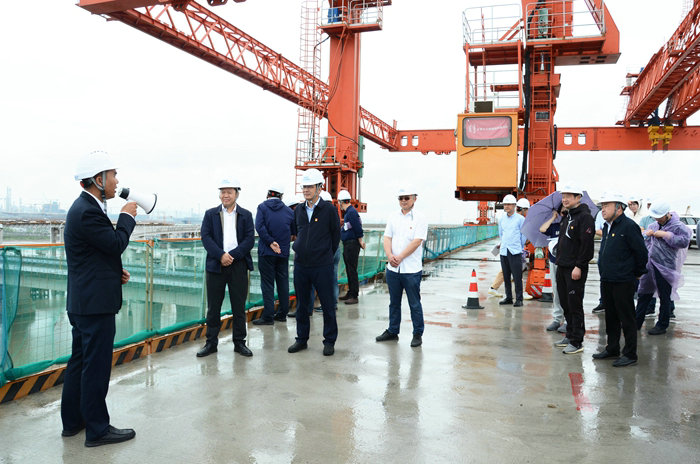 上午10點,由寧波市交通局、業(yè)主、施工單位、監(jiān)理公司組成的55人觀摩團沿杭甬復(fù)線主線橋面到達濱?;ネê诵膮^(qū)域。顧偉軍和樊獻鵬聽取了業(yè)主現(xiàn)場負責(zé)人陳宜保就濱?;ネㄈ绾瓮黄茙讉€關(guān)鍵節(jié)點,為施工贏得主動等情況介紹。公司副總經(jīng)理兼杭甬項目黨支部書記、項目負責(zé)人黃偉匯報了濱?;ネㄩ_工以來的安全質(zhì)量、進度環(huán)保以及近期的架梁情況。他說,第一條匝道架梁已成功上跨金塘大橋,另外兩條匝道6月底也將完成上跨,有壓力,有風(fēng)險,但再大的困難也要克服。全體觀摩人員沿著主線橋兩側(cè)俯視完工的匝道橋和正在架設(shè)鋼混疊合梁的匝道,對這座即將完工的亞洲最大的海上互通贊不絕口,紛紛舉起相機對準(zhǔn)縱橫交錯的匝道橋拍照,有的打開錄像功能錄像,有的拍照留念。顧偉軍和樊獻鵬一直面帶笑容,對濱海互通工程進展、質(zhì)量、安全、環(huán)保等很滿意。顧偉軍說:“濱?;ネㄊ菍幉ㄊ械牡貥?biāo)性建筑,海上施工,十五局克服了不少困難,能取得今天的成績不容易,希望把后期工程干好,期待完美收官好消息。”樊獻鵬提出三點要求:一是要做好夏季防暑降溫工作,保護好每一個員工。二是架梁是高空作業(yè),每一片梁都是100多噸,安全措施要落實到位,不能有絲毫麻痹,要確保萬無一失。三是橋面、護欄等附屬工程也很重要,要保證質(zhì)量,不能出現(xiàn)明顯的瑕疵。”