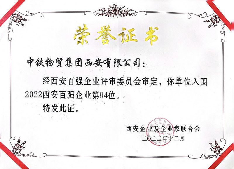 近日,西安市“2022西安百強(qiáng)企業(yè)”榜單隆重揭曉,中鐵物貿(mào)西安公司成功入圍榜單第94位。自2019年進(jìn)入西安百強(qiáng)企業(yè)榜單以來,西安公司連續(xù)4年穩(wěn)居行列。