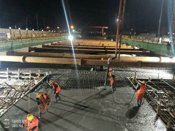 圖為員工們正在精心澆筑混凝土