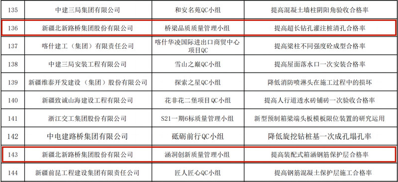 宿州訊(通訊員 孫夢凱)近日,從新疆維吾爾自治區(qū)建筑業(yè)協會傳來捷報,由北新路橋集團安徽宿固公司申報的2項QC成果獲優(yōu)異成績,均獲得Ⅱ類成果獎項,充分體現了該公司較強的技術攻關和扎實的質量控制能力。