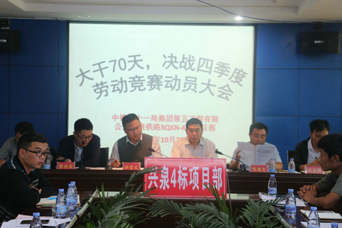凝心聚力,堅(jiān)定信心。10月20日下午,中鐵二十一局集團(tuán)五公司興泉鐵路四標(biāo)項(xiàng)目部召開(kāi)“大干70天 決戰(zhàn)四季度”勞動(dòng)競(jìng)賽動(dòng)員會(huì)。局指揮部黨工委書(shū)記高湛齊、分部班子成員、各部室、各架子隊(duì)、拌合站及各勞務(wù)隊(duì)負(fù)責(zé)人共計(jì)70余人參加。