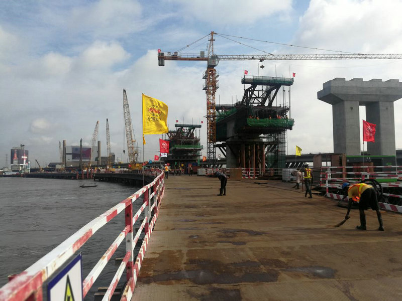 拉各斯輕軌跨Lagoon湖高架橋是尼日利亞首座采用掛籃施工的橋梁,全長(zhǎng)530米,其中深水區(qū)380米采用剛構(gòu)連續(xù)梁形式跨越。目前,該項(xiàng)目已進(jìn)入懸灌梁施工階段,已成橋174.7米,完成總投資33%。