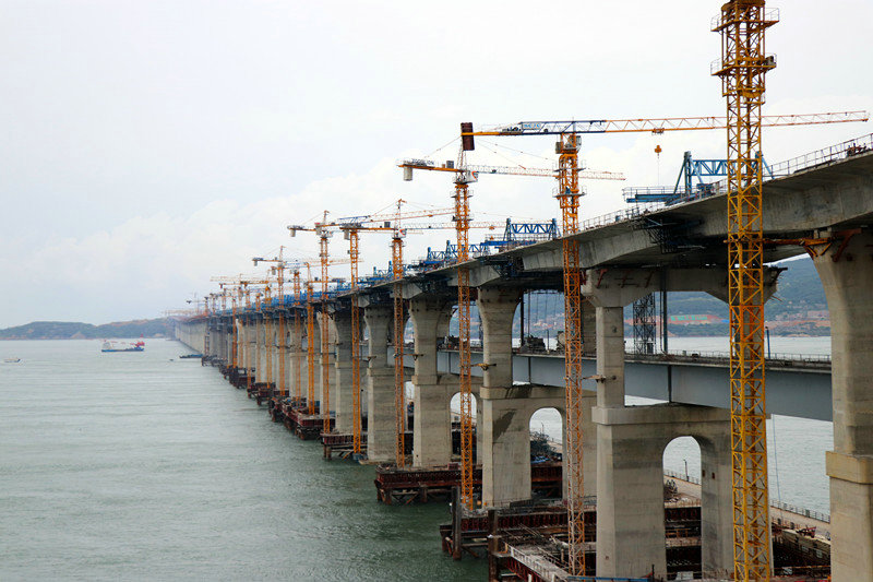 福平鐵路平潭海峽公鐵兩用大橋,大橋全長16.3km,是世界上最長、最大跨度的跨海峽公鐵兩用大橋。采用雙層橋面,上層是六車道時(shí)速100公里高速公路,下層是可供動(dòng)車組列車行駛的速200公里的雙線I級(jí)鐵路,它是中國第一座真正意義上的公鐵兩用跨海大橋。中鐵建大橋局一公司承建平潭海峽公鐵兩用大橋(B39~B58)跨越北東口水道,全長1436m。鐵路主橋92+2×168+92m預(yù)應(yīng)力混凝土連續(xù)剛構(gòu),引橋64m、40m簡(jiǎn)支箱梁。公路主橋92+2×168+92m預(yù)應(yīng)力混凝土連續(xù)剛構(gòu),引橋左右幅各5聯(lián)連續(xù)箱梁,孔跨與鐵路簡(jiǎn)支梁跨度相對(duì)應(yīng)。該橋于2013年11月開工建設(shè),經(jīng)過“鐵軍”中鐵建大橋局?jǐn)?shù)千名建設(shè)者近5年的艱辛努力,目前主橋鐵路梁已順利合攏,這是“基建狂魔”在建橋禁區(qū)內(nèi)取得又一次大捷,橋梁猶如巨龍般橫亙于碧波蕩漾大平潭海峽之上。