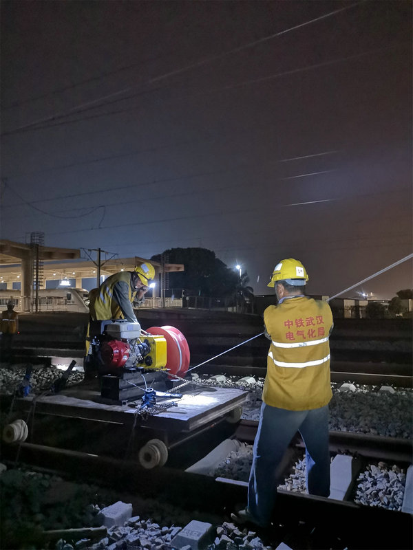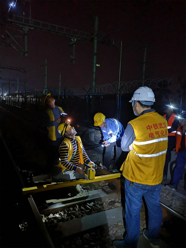 月黑風(fēng)高夜,施工正忙時(shí),2018年10月19日晚,中鐵武漢電氣化局廣州分公司梅汕電氣化項(xiàng)目部在潮汕高鐵站東岔區(qū)進(jìn)行013#至073#下行AF線架設(shè)(施工里程:杭深線K1316+031.7至K1317+325),也是潮汕高鐵站東岔區(qū)改造影響較大的最后一根附加線架設(shè),此AF線架設(shè)的完成預(yù)示著潮汕站改施工將進(jìn)入白熱化階段,隨著下一步既有附加線的拆除施工面將全面展開(kāi),為10月30日工程竣工奠定了基礎(chǔ)。