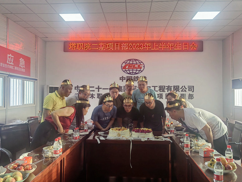 6月9日,中鐵二十一局塔里木職業(yè)技術(shù)學(xué)院二期項(xiàng)目部為2023年上半年生日的職工舉辦集體生日會(huì),讓廣大職工在緊張繁忙的工作之余感受組織的關(guān)愛(ài),心情得到放松。