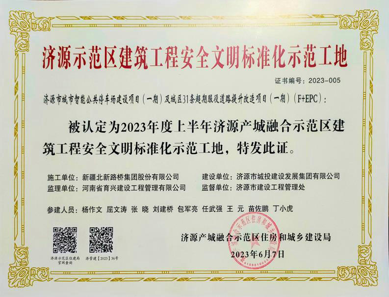 近日,北新路橋集團(tuán)西安分公司濟(jì)源市政工程項(xiàng)目榮獲“濟(jì)源示范區(qū)建筑工程安全文明標(biāo)準(zhǔn)化示范工地”稱號(hào)。