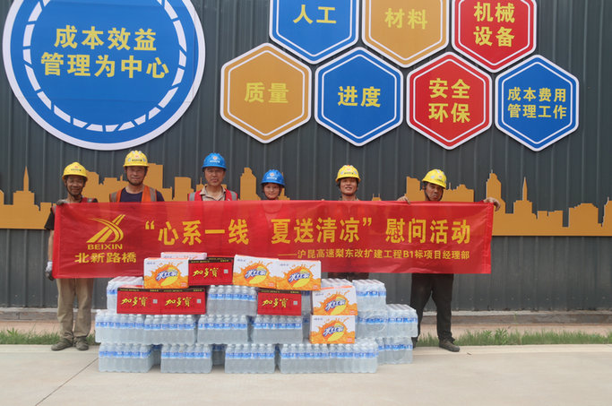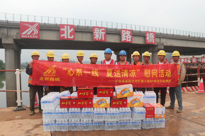 橫峰訊(通訊員翟潤潔 蔡依琳 )炎炎夏日送清涼,絲絲關(guān)愛入心田。正值大干快上火熱施工期,江西上饒地區(qū)持續(xù)高溫悶熱天氣給堅守一線的施工管理人員和建筑工人帶來了嚴(yán)峻“烤”驗。5月31日,北新路橋集團長沙分公司滬昆高速梨園至東鄉(xiāng)段改擴建工程B1標(biāo)項目(以下簡稱:滬昆B1標(biāo)項目)根據(jù)長沙分公司工會統(tǒng)一部署,組織開展了“心系一線、夏送清涼”慰問活動,為堅守施工一線,不辭勞苦付出的施工管理人員和建筑工人,送上一份清涼、一份關(guān)懷。