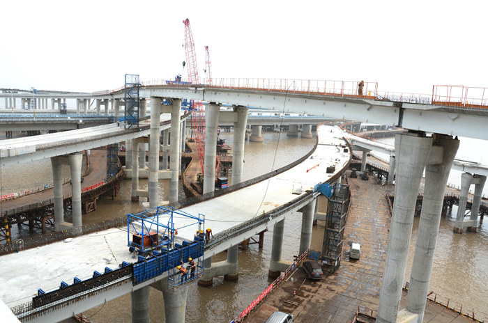 目前,濱?;ネ芰?36片,占470片總量的90.15%,除完成B匝道架梁外, G、E、F、H等4座匝道在之前已經(jīng)架設完畢,其中F匝道成功上跨金塘大橋,6月25—28日,A、D兩座匝道橋也將上跨金塘大橋。