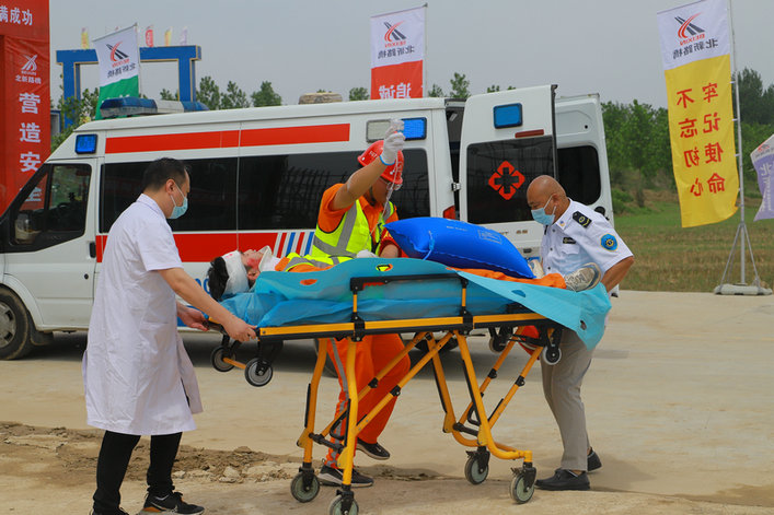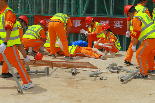 本次演練模擬新汴河特大橋施工現(xiàn)場安全爬梯安裝施工時,施工作業(yè)人員因未掛安全帶,失足從爬梯上墜落,導(dǎo)致發(fā)生高處墜落事故,作業(yè)人員頭部及腿部受傷嚴(yán)重。接到事故通知后,項目部立即啟動應(yīng)急救援預(yù)案,保衛(wèi)警戒組、應(yīng)急救援組、通信聯(lián)絡(luò)組、醫(yī)療救護組、后勤保障組、善后處理組等攜帶救援設(shè)備迅速趕赴現(xiàn)場實施救援,同時協(xié)調(diào)醫(yī)院等外部救援力量,讓傷者迅速得到進一步治療。演練過程中,各應(yīng)急救援小組反應(yīng)迅速、分工明確、緊密配合,第一時間開展救援并成功處置險情。
