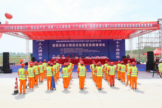 宿州訊(通訊員 劉繼紅)6月21日,兵團交建公司安徽宿固高速TJ02合同段項目組織開展高空墜落應(yīng)急救援演練活動。宿州市交通局陳鳳軍局長、宿州交通執(zhí)法大隊郁副梅支隊長、埇橋區(qū)應(yīng)急局胡少山主任、宿州市皖北醫(yī)院急救中心安小峰主任、宿固高速公司領(lǐng)導(dǎo)及宿固高速項目各參建單位代表等100余人參加活動。
