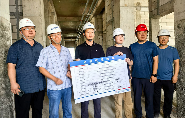 6月3日,筆者跟隨由業(yè)主、監(jiān)理、設(shè)計(jì)等參建專家組成的教學(xué)樓主體工程驗(yàn)收小組,體驗(yàn)驗(yàn)收過(guò)程。嚴(yán)謹(jǐn)認(rèn)真的專家們對(duì)照驗(yàn)交規(guī)范、實(shí)體基礎(chǔ)資料、原材檢測(cè)資料、過(guò)程施工影像資料,逐層檢測(cè)墻體質(zhì)量、丈量幾何尺寸,經(jīng)過(guò)嚴(yán)格檢驗(yàn),建筑實(shí)體質(zhì)量、感觀度完全達(dá)到規(guī)范標(biāo)準(zhǔn)。驗(yàn)收組成員依次在“可視驗(yàn)收牌”上簽字,主體工程順利通過(guò)驗(yàn)收,節(jié)點(diǎn)工期再次實(shí)現(xiàn)新突破,全面進(jìn)入室內(nèi)外附屬工程配套及裝飾裝修的攻堅(jiān)階段。