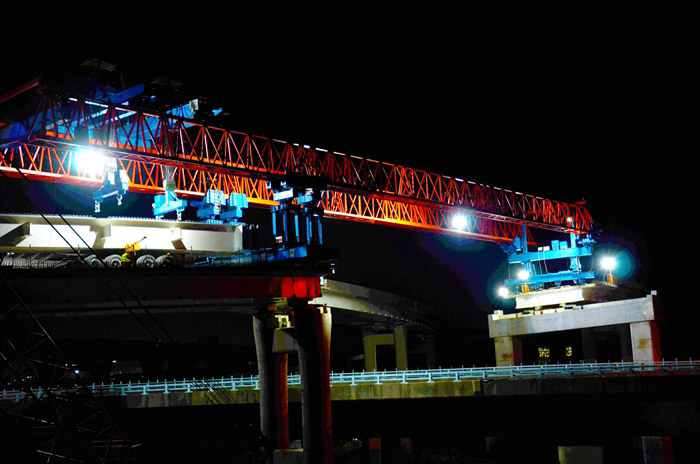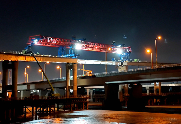 在現(xiàn)場指揮人員指揮下,兩臺架橋機分別在A、D匝道上同時架梁,經(jīng)過4個多小時的操作,先后完成13道工序操作流程,將4片40米長的疊合梁一次性安全架設(shè)到位,成功上跨金塘大橋。