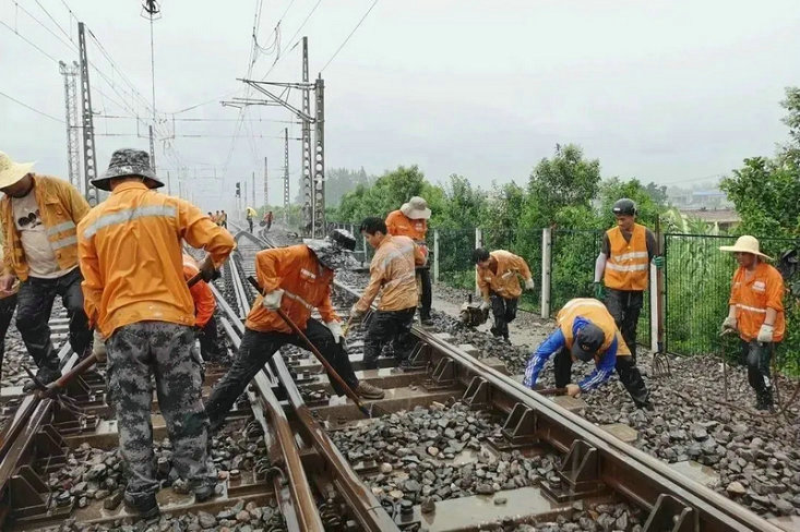 在雨中的鐵路上挖呀、挖呀、挖……先用耙、再用叉、我用鎬、你用鍬,挖出一筐筐泥砟向外倒……7月19日中午,安徽阜陽地區(qū)突降大雨。在京九鐵路安徽境內(nèi)王寨站南端道岔,近十名青年工人冒著大雨進行道床清篩作業(yè)。