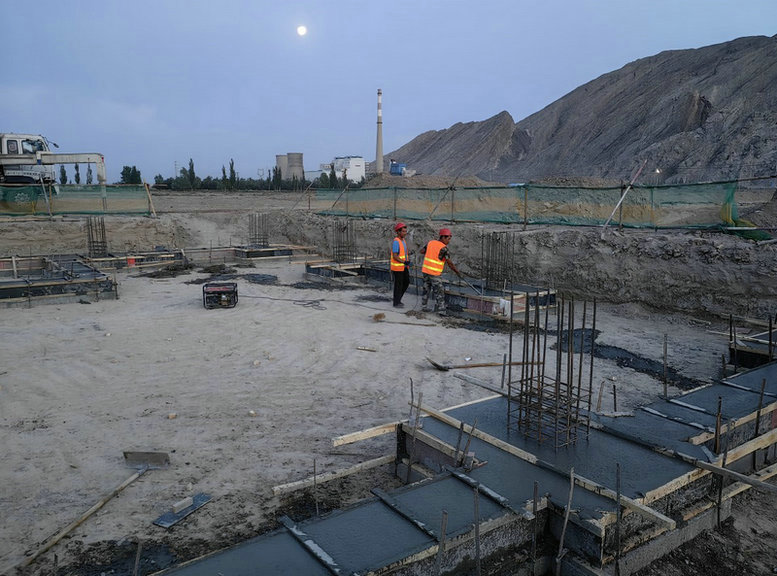 22時,天空漸暗、夜幕低垂,圖木舒克經(jīng)濟技術(shù)開發(fā)區(qū)唐王城新型材料產(chǎn)業(yè)園一期安陽路、康平路片區(qū)基礎(chǔ)設(shè)施建設(shè)項目(三標段)施工現(xiàn)場,工人們依舊堅守一線,熟練的展示著鋼筋一秒綁扎成型,挖掘機、鏟車、泵車你來我往。