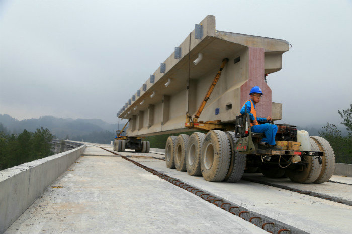 運(yùn)梁車平穩(wěn)地行駛在鐵爐堡特大橋上