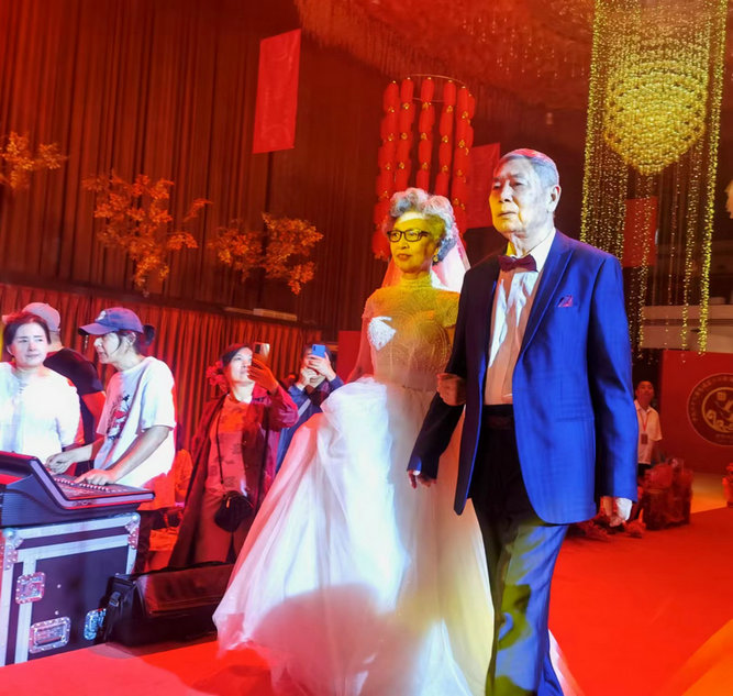 喜結(jié)百年緣,攜手一生情?;槎Y進行時,退休老職工杜然精神矍鑠地與相濡以沫50年的老伴牽手入場,緊隨其后結(jié)婚40、30、20、10周年的5對“老工程”夫妻代表依次入場,向新人贈送五谷禮,并送上深深祝福。每一絲絲白發(fā)都連接著一個個項目,每一次次奉獻見證了一場場拼搏。接過老一輩鐵建人的接力棒,讓光彩的事業(yè)薪火傳承;不忘創(chuàng)業(yè)者的傾情奉獻,續(xù)寫鐵建人的驕傲和榮光。公司領(lǐng)導的良苦用心感動全場,雷鳴般的掌聲經(jīng)久不息。