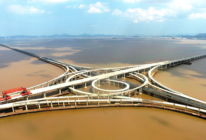 濱?;ネㄈL(zhǎng)9705米,由1座主線、4座拼寬、8座匝道組成,設(shè)樁基1027根、169座承臺(tái)、636座橋墩、232跨470片鋼混疊合梁。2021年初開工以來(lái),該集團(tuán)克服新冠疫情、4次臺(tái)風(fēng)襲擊帶來(lái)的不利因素,主線棧橋順利下穿金塘大橋,安全跨越海底盾構(gòu)隧道、原油管道、電纜等多條管線,排除了潛伏在海底的“定時(shí)炸彈”。同時(shí),積極優(yōu)化施工方案,破解了海下泥巖、碎巖等給鋼護(hù)筒打插、鉆孔造成的難題,為樁基施工清楚了障礙。