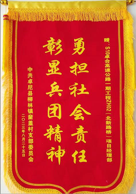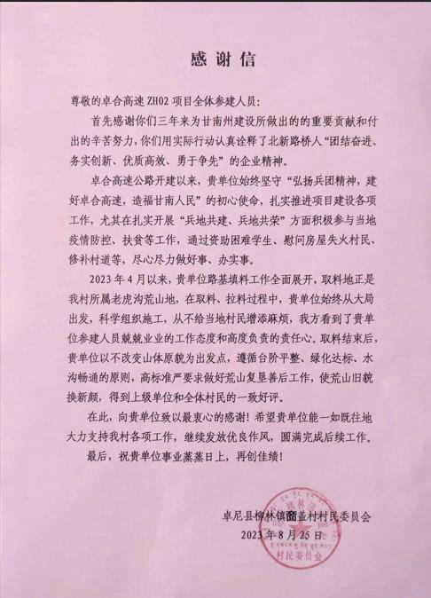 8月25日,北新路橋集團西安分公司甘肅卓合高速ZH02項目收到卓尼縣柳林鎮(zhèn)奤蓋村黨支部送來“勇擔社會責任,彰顯兵團精神”的錦旗和感謝信。信中對該項目積極參與屬地“兵地共建”,為區(qū)域發(fā)展作出的貢獻致以衷心感謝。